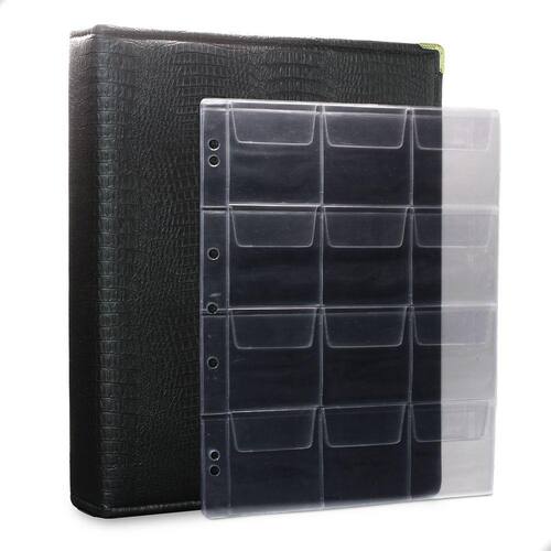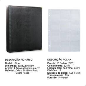 Álbum Fichário 10 Folhas para 120 Moedas 32x24 Ziper Cobra Fosco GG é um kit de fichário que acompanha folhas para Moedas tamanho 32x24cm, a transparência da folha é alta e cristalina, de forma que é possível ver sua moeda sem interferências, e de ambos os lados: frente e verso, dessa forma é possível apreciar sua coleção da melhor forma. Esse kit de folhas é feito em um material resistente sendo o principal organizador de moedas colecionáveis.