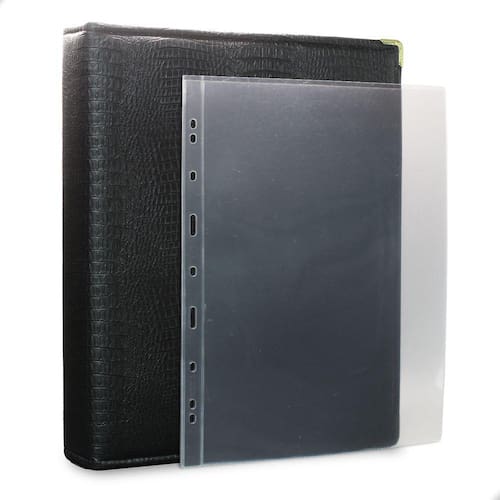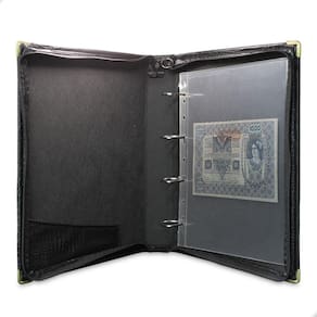 Álbum Fichário 10 Folhas para Cédulas 1 Espaço 32x24 Ziper Cobra Fosco GG, é um kit de fichário que acompanha folhas para cédulas em acetato tamanho 32x24cm, a transparência da folha é alta e cristalina, de forma que é possível ver sua cédula sem interferências, e de ambos os lados: frente e verso, dessa forma é possível apreciar sua coleção da melhor forma. Esse kit de folhas é feito em um material resistente sendo o principal organizador de cédulas colecionáveis para colecionador.
