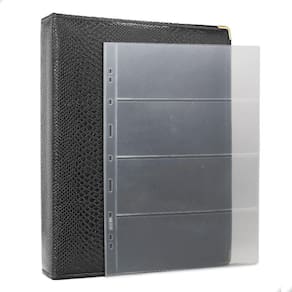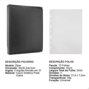 Álbum Fichário 10 Folhas para Cédulas 4 Espaços 32x24 Ziper Cobra GG, é um kit de fichário que acompanha folhas para cédulas em acetato tamanho 32x24cm, a transparência da folha é alta e cristalina, de forma que é possível ver sua cédula sem interferências, e de ambos os lados: frente e verso, dessa forma é possível apreciar sua coleção da melhor forma. Esse kit de folhas é feito em um material resistente sendo o principal organizador de cédulas colecionáveis para colecionador.
