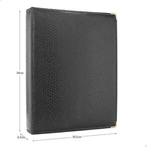 O fichário é produzido em capa sintética com cantoneiras para proteção, material de alta qualidade para armazenar com segurança e de forma organizada sua coleção, ele é muito resistente confeccionado com 4 argolas em formato ‘D’ em aço inoxidável reforçado, permitindo o encaixe da folha de até 32x24cm, processo de fabricação artesanal permitindo um excelente acabamento.