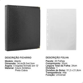 O fichário é produzido em capa sintética com cantoneiras para proteção, material de alta qualidade para armazenar com segurança e de forma organizada sua coleção, ele é muito resistente confeccionado com 4 argolas em formato ‘D’ em aço inoxidável reforçado, permitindo o encaixe da folha de até 32x24cm, processo de fabricação artesanal permitindo um excelente acabamento.