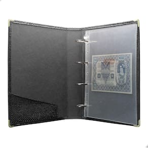 Álbum Fichário 20 Folhas para Cédulas 1 Espaço 32x24 Cobra G, é um kit de fichário que acompanha folhas para cédulas em acetato tamanho 32x24cm, a transparência da folha é alta e cristalina, de forma que é possível ver sua cédula sem interferências, e de ambos os lados: frente e verso, dessa forma é possível apreciar sua coleção da melhor forma. Esse kit de folhas é feito em um material resistente sendo o principal organizador de cédulas colecionáveis para colecionador.