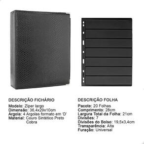 O Álbum Fichário 20 Folhas para Selos 7 Espaços 28x21 Cobra XL, é um kit de fichário que acompanha folhas para selos em acetato preto tamanho 28x21cm, a transparência da folha é alta e cristalina, de forma que é possível ver sua cédula sem interferências, dessa forma é possível apreciar sua coleção da melhor forma. Esse kit de folhas é feito em um material resistente sendo o principal organizador de cédulas colecionáveis para colecionador.