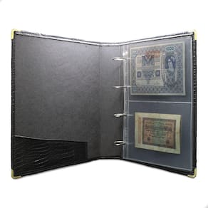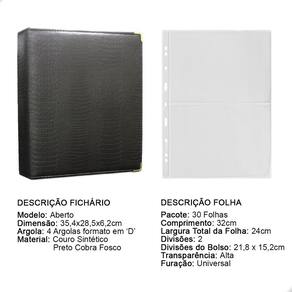 Álbum Fichário 30 Folhas para Cédulas 2 Espaços 32x24 Cobra Fosco G, é um kit de fichário que acompanha folhas para cédulas em acetato tamanho 32x24cm, a transparência da folha é alta e cristalina, de forma que é possível ver sua cédula sem interferências, e de ambos os lados: frente e verso, dessa forma é possível apreciar sua coleção da melhor forma. Esse kit de folhas é feito em um material resistente sendo o principal organizador de cédulas colecionáveis para colecionador.