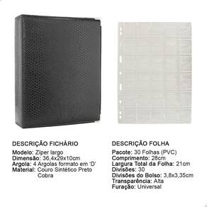 O Álbum Fichário 30 Folhas para 900 Moedas 28x21 Cobra XL, é um kit de fichário que acompanha folhas para Moedas tamanho 28x21cm, a transparência da folha é alta e cristalina, de forma que é possível ver sua moeda sem interferências, e de ambos os lados: frente e verso, dessa forma é possível apreciar sua coleção da melhor forma. Esse kit de folhas é feito em um material resistente sendo o principal organizador de moedas colecionáveis.