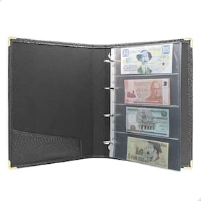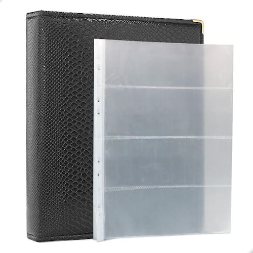 Álbum Fichário 30 Folhas PP para Cédulas 4 Espaços 32x24 Cobra GF, é um kit de fichário que acompanha Folhas PP. Seu acabamento é transparente, podendo visualizar as cédulas frente e verso. Essa folha é ideal para você criar aquele mostruário que sempre desejou com sua coleção de cédulas antigas, nacionais ou estrangeras e finalmente poder mostrar sua coleção toda organizada para sua família e amigos.