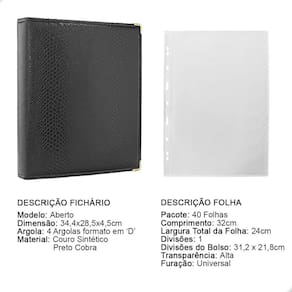 O fichário é produzido em capa sintética com cantoneiras para proteção, material de alta qualidade para armazenar com segurança e de forma organizada sua coleção, ele é muito resistente confeccionado com 4 argolas em formato ‘D’ em aço inoxidável reforçado, permitindo o encaixe da folha de até 32x24cm, processo de fabricação artesanal permitindo um excelente acabamento.