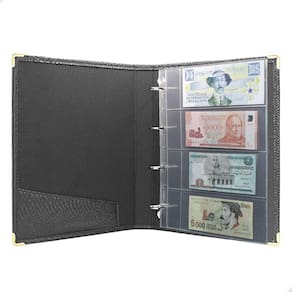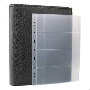 Álbum Fichário 40 Folhas para Cédulas 4 Espaços com Bolso 32x24 Cobra GF, é um kit de fichário que acompanha folhas para cédulas em acetato tamanho 32x24cm, a transparência da folha é alta e cristalina, de forma que é possível ver sua cédula sem interferências, e de ambos os lados: frente e verso, dessa forma é possível apreciar sua coleção da melhor forma. Esse kit de folhas é feito em um material resistente sendo o principal organizador de cédulas colecionáveis para colecionador.