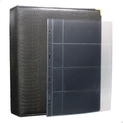 Álbum Fichário 40 Folhas para Cédulas 4 Espaços com Bolso 32x24 Cobra Fosco G, é um kit de fichário que acompanha folhas para cédulas em acetato tamanho 32x24cm, a transparência da folha é alta e cristalina, de forma que é possível ver sua cédula sem interferências, e de ambos os lados: frente e verso, dessa forma é possível apreciar sua coleção da melhor forma. Esse kit de folhas é feito em um material resistente sendo o principal organizador de cédulas colecionáveis para colecionador.