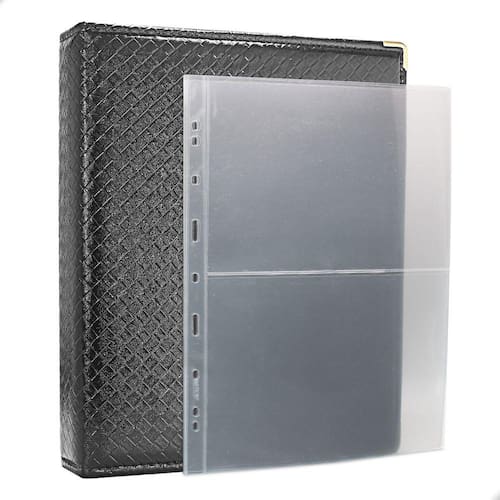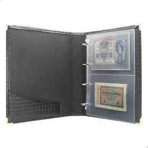 Álbum Fichário 40 Folhas para Cédulas 2 Espaços 32x24 3D GF, é um kit de fichário que acompanha folhas para cédulas em acetato tamanho 32x24cm, a transparência da folha é alta e cristalina, de forma que é possível ver sua cédula sem interferências, e de ambos os lados: frente e verso, dessa forma é possível apreciar sua coleção da melhor forma. Esse kit de folhas é feito em um material resistente sendo o principal organizador de cédulas colecionáveis para colecionador.