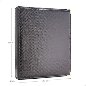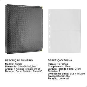 O fichário é produzido em capa sintética com cantoneiras para proteção, material de alta qualidade para armazenar com segurança e de forma organizada sua coleção, ele é muito resistente confeccionado com 4 argolas em formato ‘D’ em aço inoxidável reforçado, permitindo o encaixe da folha de até 32x24cm, processo de fabricação artesanal permitindo um excelente acabamento.