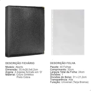 O fichário é produzido em capa sintética com cantoneiras para proteção, material de alta qualidade para armazenar com segurança e de forma organizada sua coleção, ele é muito resistente confeccionado com 4 argolas em formato ‘D’ em aço inoxidável reforçado, permitindo o encaixe da folha de até 32x24cm, processo de fabricação artesanal permitindo um excelente acabamento.