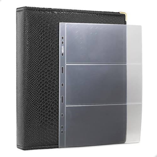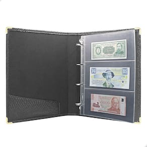 Álbum Fichário 50 Folhas para Cédulas 3 Espaços 32x24 Cobra GF, é um kit de fichário que acompanha folhas para cédulas em acetato tamanho 32x24cm, a transparência da folha é alta e cristalina, de forma que é possível ver sua cédula sem interferências, e de ambos os lados: frente e verso, dessa forma é possível apreciar sua coleção da melhor forma. Esse kit de folhas é feito em um material resistente sendo o principal organizador de cédulas colecionáveis para colecionador.