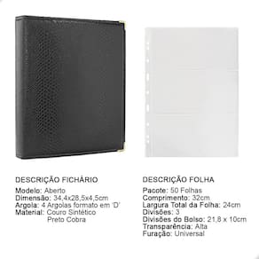 O fichário é produzido em capa sintética com cantoneiras para proteção, material de alta qualidade para armazenar com segurança e de forma organizada sua coleção, ele é muito resistente confeccionado com 4 argolas em formato ‘D’ em aço inoxidável reforçado, permitindo o encaixe da folha de até 32x24cm, processo de fabricação artesanal permitindo um excelente acabamento.