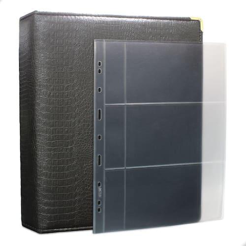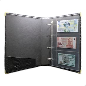 Álbum Fichário 50 Folhas para Cédulas 3 Espaços com Bolso 32x24 Cobra Fosco G, é um kit de fichário que acompanha folhas para cédulas em acetato tamanho 32x24cm, a transparência da folha é alta e cristalina, de forma que é possível ver sua cédula sem interferências, e de ambos os lados: frente e verso, dessa forma é possível apreciar sua coleção da melhor forma. Esse kit de folhas é feito em um material resistente sendo o principal organizador de cédulas colecionáveis para colecionador.