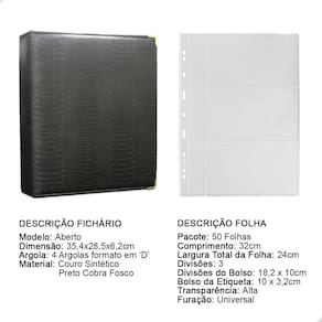 O fichário é produzido em capa sintética com cantoneiras para proteção, material de alta qualidade para armazenar com segurança e de forma organizada sua coleção, ele é muito resistente confeccionado com 4 argolas em formato ‘D’ em aço inoxidável reforçado, permitindo o encaixe da folha de até 32x24cm, processo de fabricação artesanal permitindo um excelente acabamento.