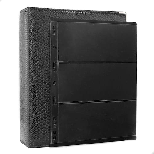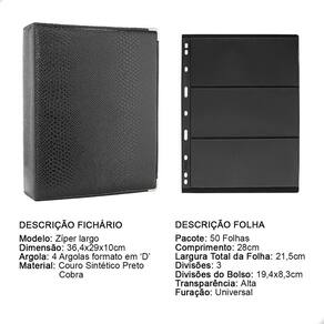 O Álbum Fichário 50 Folhas para Selos 3 Espaços 28x21 Cobra XL, é um kit de fichário que acompanha folhas para selos em acetato preto tamanho 28x21cm, a transparência da folha é alta e cristalina, de forma que é possível ver sua cédula sem interferências, dessa forma é possível apreciar sua coleção da melhor forma. Esse kit de folhas é feito em um material resistente sendo o principal organizador de cédulas colecionáveis para colecionador.