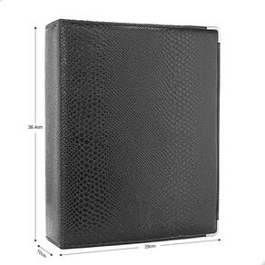 O fichário é produzido em capa sintética com cantoneiras para proteção, material de alta qualidade para armazenar com segurança e de forma organizada sua coleção, ele é muito resistente confeccionado com 4 argolas em formato ‘D’ em aço inoxidável reforçado, permitindo o encaixe da folha de até 28x21cm, processo de fabricação artesanal permitindo um excelente acabamento.