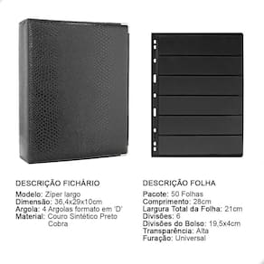 O Álbum Fichário 50 Folhas para Selos 6 Espaços 28x21 Cobra XL, é um kit de fichário que acompanha folhas para selos em acetato preto tamanho 28x21cm, a transparência da folha é alta e cristalina, de forma que é possível ver sua cédula sem interferências, dessa forma é possível apreciar sua coleção da melhor forma. Esse kit de folhas é feito em um material resistente sendo o principal organizador de cédulas colecionáveis para colecionador.
