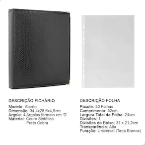 O fichário é produzido em capa sintética com cantoneiras para proteção, material de alta qualidade para armazenar com segurança e de forma organizada sua coleção, ele é muito resistente confeccionado com 4 argolas em formato ‘D’ em aço inoxidável reforçado, permitindo o encaixe da folha de até 32x24cm, processo de fabricação artesanal permitindo um excelente acabamento.