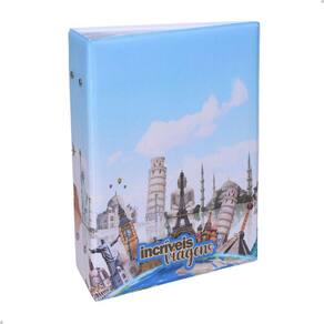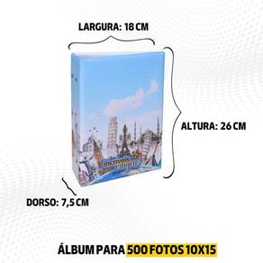 - Álbum com capa dura revestida de material sintético com 125 folhas plásticas. Cada página comporta 2 fotos 10x15 e um memo. Totalizando no álbum 500 fotos 10x15