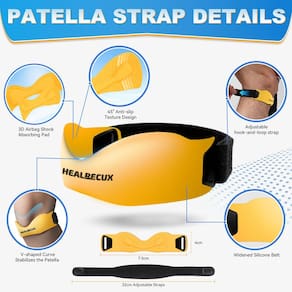 - Faixa ergonômica de silicone para patela: projetada para proteger sua patela a cada passo do caminho. Possui um acolchoamento de "20.3 cm que aplica pressão direcionada ao tendão patelar, ajudando a deslocar a pressão para longe do tendão para aliviar a dor e reduzir a tensão durante a atividade física. A joelheira de silicone ultra-flexível curva em V se adapta à forma do seu joelho, proporcionando compressão precisa de 360°