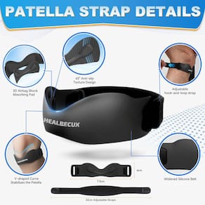 - Faixa ergonômica de silicone para patela: projetada para proteger sua patela a cada passo do caminho. Possui um acolchoamento de "20.3 cm que aplica pressão direcionada ao tendão patelar, ajudando a deslocar a pressão para longe do tendão para aliviar a dor e reduzir a tensão durante a atividade física. A joelheira de silicone ultra-flexível curva em V se adapta à forma do seu joelho, proporcionando compressão precisa de 360°