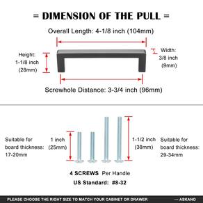 [Medidas] Centros dos furos: 3-3/4 polegadas (96 mm); Comprimento total: 4-1/8 polegadas (104 mm); Largura: 3/8 polegadas (9 mm); Altura: 1-1/8 polegadas (28 mm). [Fácil instalação] Cada puxador vem com dois conjuntos de parafusos que se encaixam em portas de armário comuns e gavetas para facilitar a instalação. [Design exclusivo] Escolhido para uma sensação tátil e acabamento superior, esta alça oferece uma aderência suave e confortável, bem como atração visual impactante. [Ampla compatibilidade] Esta alça é adequada para várias decorações e dará à sua casa um toque muito elegante, moderno e bonito. [Aviso antes da compra] Antes de fazer um pedido, meça os centros dos orifícios da tração atual. Verifique se o comprimento total deste puxador é adequado para o tamanho dos seus armários. - Material: cor e design: Feito de liga de zinco em preto, durável e à prova de ferrugem; a parte inferior da empunhadura é curvada para uma sensação suave e confortável. - Tamanhos e parafusos: Centros dos furos: 9,5 cm, comprimento total: 10,5 cm. 2 tamanhos de parafusos (2,5 cm e 1-1/5.1 cm) anexados para caber na porta do armário e gaveta. - Embalagem segura: cada puxador é embalado com cuidado para evitar arranhões ou danos; os clientes receberão os produtos em boas condições. - Serviço pós-venda sem preocupações: Qualquer dúvida ou problema com os produtos, com nossa equipe de pós-venda para suporte e serviço completo. - Amplas aplicações: Elegante e funcional, decoração perfeita para armário de cozinha, gaveta de mesa, cômoda, banheiro, porta de móveis, penteadeira, armário, quarto, guarda-roupa, armário, armário, baú, estante, cabana, aparador, etc.