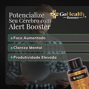 Suplemento para potencializar seu cérebro e foco. Descubra a sua melhor versão eliminando a procrastinação, falta de atenção e distrações contínuas do seu dia a dia. Turbine a sua produtividade e aumente a concentração com o Alert Booster. Fórmula 100% natural. Livre de vícios e efeitos colaterais. Matéria-prima premium. O Alert Booster foi desenvolvido por médicos com base em estudos científicos, resultando em uma fórmula balanceada e cuidadosamente elaborada com diversos ingredientes que auxiliam na melhoria do foco, concentração cerebral e produtividade. É o único booster do mercado que reúne o poder do Magnésio Bisglicinato, Vitamina B6, Vitamina B1, Taurina, Guaraná, Cafeína, Fenilalanina, Tirosina e Vitamina B3 no mesmo suplemento. Magnésio bisglicinato 10 mg - Forma altamente absorvível de magnésio que suporta a função muscular e nervosa saudável, contribuindo para a redução do e melhorando a qualidade do sono. Vitamina B6 1,3 mg - Essencial para o metabolismo das proteínas, carboidratos e gorduras, além de desempenhar um papel crucial na saúde do sistema nervoso, ajudando na produção de neurotransmissores como a serotonina. Vitamina B1 1,2 mg - Também conhecida como tiamina, é essencial para o metabolismo energético e a função cerebral saudável, ajudando na produção de energia a partir dos alimentos que consumimos. Taurina 70 mg - Aminoácido que desempenha um papel importante na regulação do humor, função cardiovascular e na proteção dos tecidos do corpo contra danos oxidativos, especialmente no cérebro e no coração. Guaraná 50 mg - Fonte natural de cafeína, que estimula o sistema nervoso central, aumentando a energia, o foco e a concentração, além de possuir propriedades antioxidantes. Cafeína 75 mg - do sistema nervoso central que melhora o estado de alerta, a concentração e o desempenho cognitivo, além de aumentar a energia e a capacidade de resistência. Fenilalanina 263 mg - Aminoácido precursor de neurotransmissores como a dopamina, que desempenha um papel crucial no humor, na motivação e na cognição, melhorando a atenção e o foco. Tirosina 263 mg - Aminoácido que auxilia na produção de neurotransmissores como a dopamina, norepinefrina e adrenalina, contribuindo para a melhoria do humor, da memória e do desempenho cognitivo. Vitamina B3 10 mg - Também conhecida como niacina, é essencial para o metabolismo energético e a saúde do sistema nervoso, além de desempenhar um papel importante na saúde da pele, digestão e na redução do . Benefícios proporcionados pelo Alert Booster: Melhora na capacidade cognitiva Aumento do foco e concentração Impulso de energia mental Melhora no gerenciamento do Aumento da criatividade e produtividade Produtividade continuada Dosagem diária: 2 cápsulas ao dia. As fórmulas dos produtos GoHealth são compostas por ingredientes 100% naturais e sem aditivos químicos. Segue rigorosamente a legislação vigente conforme as normas da ANVISA - Agência Nacional de Vigilância Sanitária. Este produto não é indicado para gestantes, lactantes ou crianças.