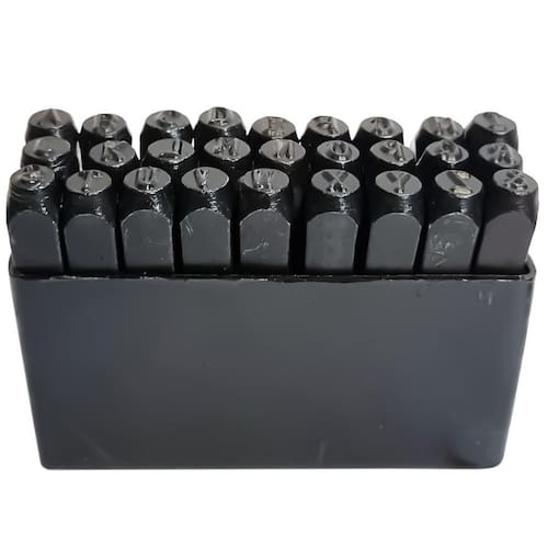 - Marca: Eda - Referência: 5KD - Espessura da escrita: 4mm - Contém 27 peças. Letras de A a Z letras maiúsculas e & caractere especial - Marcadores feito em aço com tratamento térmico de elevada dureza - Indicado para marcação e gravação manual de informações em aço, alumínio, cobre, couro, borracha, madeira e etc - Punções em aço são ideais para fazer marcação numérica em baixo relevo em uma peça que se deseja perfurá-la ou desmarcá-la para poder dar continuidade ao trabalho - Em determinados casos também serve de apoio e suporte para empurrar parafusos ou peças para determinado local - Kit de bater, não aceita aquecimento para marcação - Acompanha caixa plástica protetora para armazenamento cor pode varias de acordo com o lote - Garantia: 90 dias
