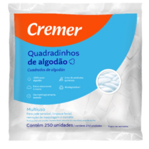 Os quadrados de Algodão Cremer são confeccionadas com fibras 100% algodão, macios e com ótimo poder de absorção. - 100% puro algodão - Extra-absorvente e macio - Dermatologicamente testado - Livre de produtos químicos - Biodegradável Multiuso: Para pele sensível, limpeza facial, remoção de maquiagem e esmalte. Contém: 250 quadradinhos de aproximadamente 4,5cm x 4,5cm Marca: Cremer
