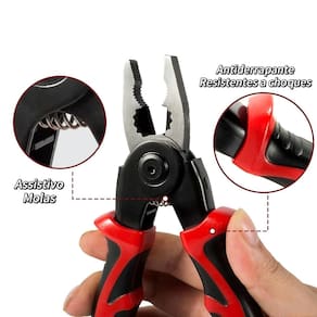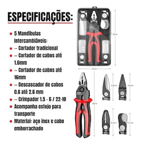 Funções: Alicate universal, alicate de corte diagonal, alicate de descascar fios, alicate tesoura, alicate crimpador