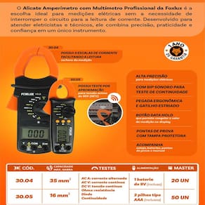Alicate Amperímetro Com Multímetro Profissional Foxlux - 35mm