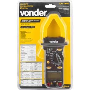 Marca:vonderconteúdo da embalagem:1 alicate amperímetro digital. Acompanha: 1 par de pontas de prova, 1 estojo para transporte e 1 termopar.Descrição:alicate amperímetro digital aav 2000 vonderindicações:indicado para medições de corrente ac e dc até 1.000 a. Realiza também medidas de tensão ac e dc, resistência, continuidade, teste de diodo, capacitância, temperatura e frequência 1 v 10 v rms . Ideal para profissionais e técnicos que necessitam fazer medições em painéis elétricos, linhas de alimentação, sistemas de iluminação, uso automotivo e sistemas que operam também em corrente contínua.Características técnicas:categoria do multímetro: cat iii 600v capacidade de tensão ac do alicate amperímetro: 700 v capacidade corrente ac do alicate amperímetro: 1.000 a capacidade corrente dc do alicate amperímetro: 1000a capacidade máxima de resistência do alicate amperímetro: 40 m Faixa de medição de temperatura do alicate amperímetro: 400c 750c / 0c 400c / -40c 0c capacidade de medição de capacitância do alicate amperímetro: 40 f abertura máxima da garra do alicate amperímetro: 42,0 mm função tecla hold do alicate amperímetro: possui categoria do alicate amperímetro: cat iii 600 v / cat ii 1.000 v capacidade máxima de frequência: 100 khz número de dígitos / contagem do alicate amperímetro: 3 3/4 dígitos - 0 a 3999codigo do forncedor:3870200000 Marca: Não Informado