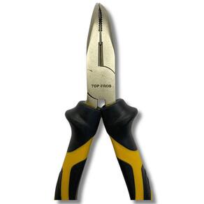 O alicate de bico torto 8 polegadas, composto por aço carbono niquelado e polipropileno com Borracha termoplástica. Possui mandíbulas alongadas e curvas, projetadas para acessar espaços apertados E executar operações precisas, como: torcer fios, manipular componentes eletrônicos e cortar arames finos. A niquelação é uma camada de revestimento que protege o alicate de corrosão. A marca top pros é reconhecida pela excelência na qualidade e praticidade dos seus produtos. Ela faz parte de um grupo de outras marcas já fortemente reconhecidas no ramo de persianas, decoração, Bazar e utilidades domésticas e agora traz o seu conhecimento na área das ferramentas.
