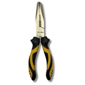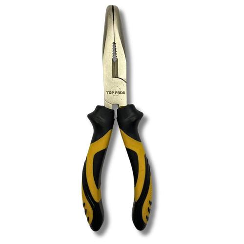 O alicate de bico torto 8 polegadas, composto por aço carbono niquelado e polipropileno com Borracha termoplástica. Possui mandíbulas alongadas e curvas, projetadas para acessar espaços apertados E executar operações precisas, como: torcer fios, manipular componentes eletrônicos e cortar arames finos. A niquelação é uma camada de revestimento que protege o alicate de corrosão. A marca top pros é reconhecida pela excelência na qualidade e praticidade dos seus produtos. Ela faz parte de um grupo de outras marcas já fortemente reconhecidas no ramo de persianas, decoração, Bazar e utilidades domésticas e agora traz o seu conhecimento na área das ferramentas.