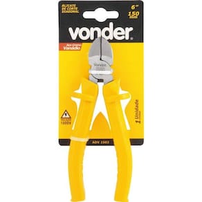 Alicate Corte Diagonal 6 Isolado 1000v Vonder Conteúdo da embalagem 1 Alicate Aplicações e dicas de uso Indicado para cortar e desencapar fios e cabos elétricos, além de arames macios Destaques e diferenciais Produzido em aço cromo vanádio, proporcionando maior durabilidade. Possui cabo isolado antiderrapante (ranhurado), com abas de proteção que conferem melhor manuseio. DETALHES TÉCNICOS