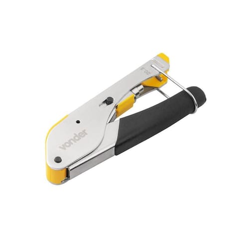 Alicate para crimpar conectores de compressão RG-59 e RG-6 em cabos coaxiais, redes de tv a cabo, satélite, sistemas coletivos prediais, residenciais e sistemas de segurança de circuito fechado. Possui tamanho reduzido e alça para travar o alicate fechado, facilitando o armazenamento.