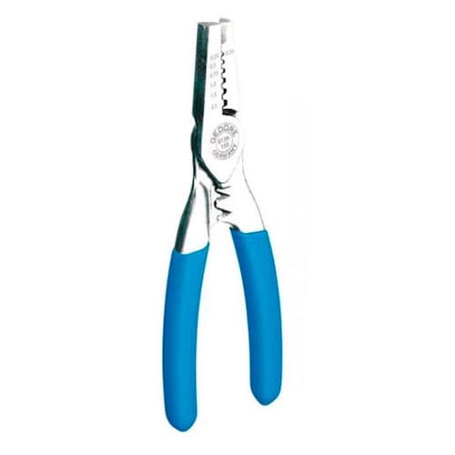 Corpo em aço especial e empunhadura plastificada na cor azul padrão Gedore. Acabamento niquelado e cromado. Indicado para prensagem de bucha aderente conforme norma DIN 46228. Permite desencapar e cortar fio flexível.