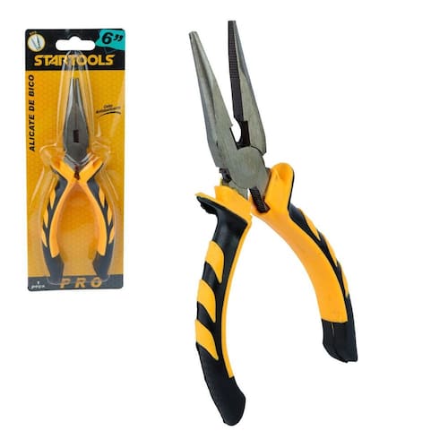 Alicate de Bico 6 O Alicate de Bico 6" é uma ferramenta indispensável para trabalhos que exigem precisão, firmeza e alcance em locais de difícil acesso. Com bico fino e alongado, ele é ideal para segurar, dobrar, cortar fios finos e manipular peças pequenas com total controle. Fabricado em aço carbono de alta resistência e com cabo emborrachado ergonômico, oferece segurança, conforto e durabilidade no uso contínuo. Perfeito para eletricistas, mecânicos, artesãos, hobistas e profissionais da manutenção em geral. Seja em casa, na oficina ou no dia a dia profissional, esse alicate garante eficiência em tarefas que exigem precisão e firmeza.\nEspecificações: Marca : STARTOOLS Tipo de material : Aço Cores ou Estampa : Amarelo Dimensões do Produto : 16 X 6 X 1,5 CM Peso Bruto (Gramas) : 0.124 O que vem na embalagem 1 Alicate de Bico 6 Marca: Não Informado