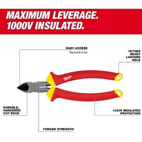 O Alicate de Corte Diagonal Isolado 1000V 8" da Milwaukee fornece máxima alavancagem para cortes fáceis. A camada de isolamento de 1000V retardante de chamas nos cabos oferece máxima proteção. O nariz afilado permite um acesso mais fácil e cortes precisos. Este alicate de corte diagonal é classificado pela UL e certificado de acordo com os padrões IEC 60900 e ASTM F1505 para ferramentas manuais isoladas. Ele é respaldado pela Garantia Vitalícia Limitada da Milwaukee.