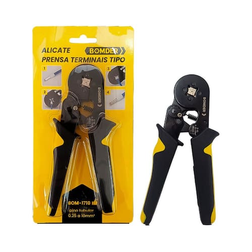 Alicate Prensa Terminais com ajuste de pinos tubulares, ideal para crimpagem de terminais do tipo pino tubular em fios e cabos com bitolas variando de 0,25 mm² a 10 mm². Seu acabamento pintado oferece uma camada de proteção contra corrosão e oxidação. Fabricado com materiais de alta durabilidade e qualidade, este alicate é perfeito para realizar crimpagem em terminais tubulares e ilhós.