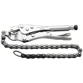 Corrente em aço especial.Corpo formado por chapas conformadas.Acabamento cromado.Abertura regulável.Possui alavanca para destravar.Os alicates de corte são testados quanto à resistência ao desgaste do gume de corte em máquina de ensaio específica.Os alicates possuem dureza diferenciada no gume de corte e no corpo.Utilizado para apertar tubos endurecidos onde uma chave para tubo não tem acesso.Não é recomendado para tubos não metálicos.Também pode ser utilizado para colocar e remover filtros de óleo.As ferramentas são produzidas e testadas conforme normas específicas.