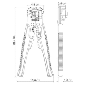 Corpo construído em aço carbono e pintura contra oxidação. Lâminas e garras fabricadas em aço ferramenta. Cabos com dupla injeção. Possui batente para controlar o tamanho do fio a ser desencapado. Fácil ajuste dos cabos a serem desencapados. Pino de micro ajuste que regula a intensidade da força para corte do fio. Desencapa fios de 24-10 AWG (0,2 a 6,0 mm). Corta fios de 24-10 AWG (0,2 a 6,0 mm). Crimpa terminais com e sem isolamento de 22-10 AWG (0,5 a 6,0 mm).