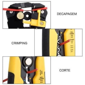 Alicate crimpador automático para decapagem de cabos 0,2 a 6mm, com 7 bitolas diferentes. Cabo ergonômico, partes em plástico técnico para maior durabilidade e resistência, reforçado com revestimento de borracha. Batente ajustador de comprimento para desencapar sempre no comprimento desejado. Pino regulador da intensidade da força, para uso diversos, profissionais de eletricidade e telefonia. O Alicate Automático Decapador e Crimpador oferece conforto e praticidade, fazendo com que seu serviço fique melhor e mais rápido.