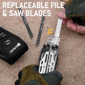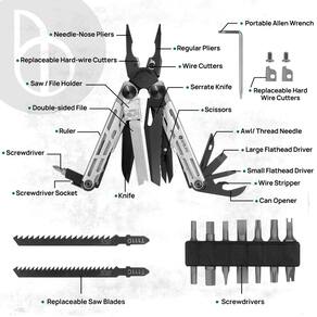 1 - Heavy-Duty Multi Tool Pro: A ferramenta multiuso BIBURY é feita de aço inoxidável de alta dureza (3Cr13), que é durável o suficiente para ambientes severos e pesados. É perfeito para entusiastas ou profissionais de atividades ao ar livre - Alicate multiferramenta tudo-em-um: esta ferramenta multifuncional com 31 ferramentas, incluindo alicates, cortadores de fio substituíveis, decapadores de fio, tesoura grande, furador, serra substituível, facas, lima de madeira/metal, furador, abridores de garrafas e latas, régua, 8 conjuntos de chaves de fenda (PH1+PH4, SP8+SP4, TT25+TT20, TT15+TT10, SL6+SL5, SL4+SL3, H5+H4, H3+H2.5), ideal para atividades ao ar livre, trabalhos domésticos, bricolage diário e muito mais - Ferramentas substituíveis e intercambiáveis: um conjunto extra de cortadores de fio substituíveis está incluído na embalagem, que são feitos de liga premium com tungstênio YG10, é durável e mais fácil de cortar hardware de aço macio. A lima e a lâmina de serra de madeira podem ser trocadas para realizar mais funções, mantendo o alicate compacto - Portátil com capa multiferramenta: o BIBURY multitool Pro vem com uma capa de náilon durável para transporte, com um bolso frontal para chaves de fenda e bolsos laterais para segurar as lâminas de serra. Com seu design leve e dobrável, você pode colocar essa ferramenta multifuncional em seu carro ou bolsa para sobreviver ao ar livre, acampar e caçar. Presente ideal para homens: a multiferramenta BIBURY é ideal para atividades externas e internas, como sobrevivência, acampamento, caminhadas, pesca, trabalho de bricolage em casa e assim por diante. Com design exclusivo e caixa bem embalada, é perfeita para presentear no Dia dos Namorados, Dia dos Pais, Natal, Aniversário ou Aniversários - Atendimento ao Cliente: a equipe BIBURY oferece aos clientes produtos e serviços de qualidade. Se você tiver algum problema após a compra, informe-nos sem qualquer hesitação. Faremos o nosso melhor para resolver problemas e atender às suas necessidades