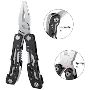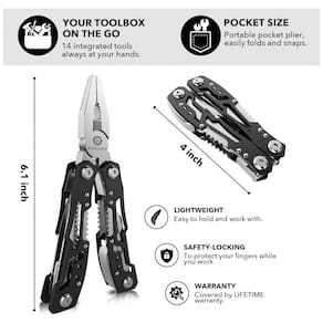 Multiferramenta 14 em 1 Multiferramenta com 14 funções, incluindo cabeças de alicate alicates de ponta longa, alicate de ponta redonda, alicate de corte, faca afiada, chave de fenda philips, chave de fendaS, faca serrilhada, removedor de gancho, lima dupla face, chave de fenda L, raspador pequeno, chave de fenda M, abridor de latas e abridor de garrafas. Travamento de segurança fangfo Multitool Com design de trava lateral, todas as ferramentas e facas exceto as cabeças do alicate serão travadas quando totalmente abertas. Pronto para qualquer coisa você nunca sabe quando precisa de uma chave de fenda, alicate ou faca, etc. Esta ferramenta multiuso é uma ótima opção para os usuários carregarem no bolso, o que é fácil de obter a ferramenta correspondente a qualquer momento. Ferramenta abrangente o conjunto de ferramentas utilitárias é perfeito para esportes ao ar livre, sobrevivência, camping, pesca, caminhadas e caça. É durável e resistente para suportar o desgaste do uso diário. Leve e portátil com tamanho compacto e design dobrável, a ferramenta utilitária dobrável é fácil de guardar ou guardar no bolso. Esta multiferramenta de bolso vem com uma bolsa de nylon que permite ser amarrada no passador do cinto e não ocupa espaço Marca: Não Informado