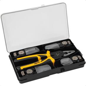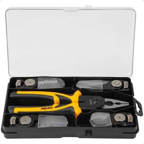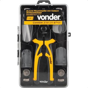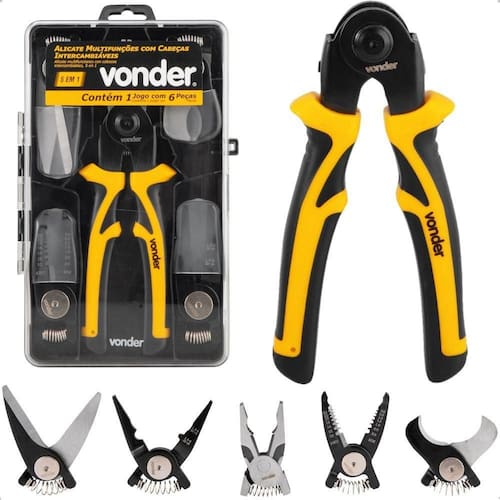 Conteúdo da embalagem: 1 Alicate Intercambiável acompanha:1 cabeça universal, 1 cabeça para decapagem de fios, 1 cabeça crimpadora de fios para terminais elétricos, 1 cabeça para corte de fios e 1 tesoura para corte de chapas metálicas.