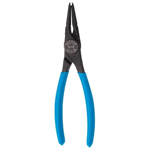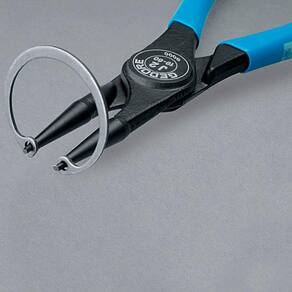 Corpo em aço Gedore-Vanadium e empunhadura plastificada na cor azul padrão Gedore. Acabamento escurecido. Alicate com pontas fixas e retas. Para anéis de segurança internos conforme norma DIN 472 e DIN 984.