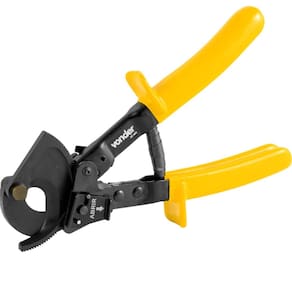 Possui cabo plastificado e mola que auxilia a abertura. Além de acionamento tipo catraca, proporcionando uma operação mais eficiente. Indicado para cortar cabos de cobre e alumínio de até 32,0mm.